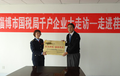 會(huì)上,舉行了授牌儀式,志賀進(jìn)總經(jīng)理從婁局長(zhǎng)手中接過了淄博市國稅局頒發(fā)的 “依法納稅 強(qiáng)國惠民” 的牌匾。